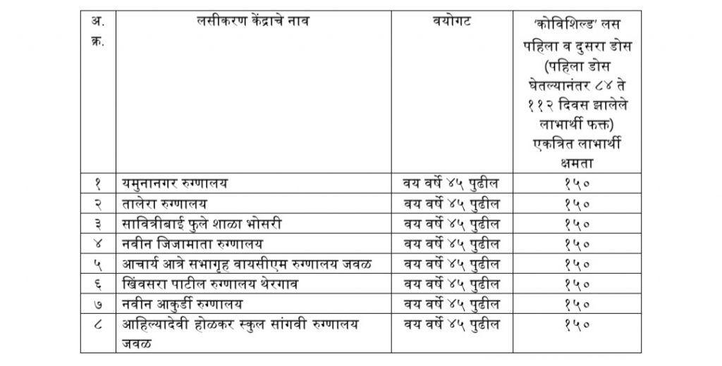केंद्र शासनाच्या मार्गदर्शक सूचनेनुसार वय वर्षे ४५ पुढील लाभार्थ्यांचे ‘कोविशिल्ड’ लसीचा पहिला डोस व ज्या लाभार्थ्यांनी पुर्वी ‘कोविशिल्ड’ या लसीचा पहिला डोस घेतला आहे, त्यांना डोसनंतर १२ ते १६ आठवडयांच्या दरम्यान म्हणजे (८४ दिवसानंतर ते ११२ दिवसपर्यंत) खालील केंद्रावर ‘कोविशिल्ड’ लसीचा पहिला व दुसरा डोस सकाळी १०.०० ते सायं. ५.०० या कालावधीत निकषानुसार उद्या दि. २१/०५/२०२१ रोजी पिंपरी चिंचवड महानगरपालिकेच्या खालील लसीकरण देण्यात येणार आहे.