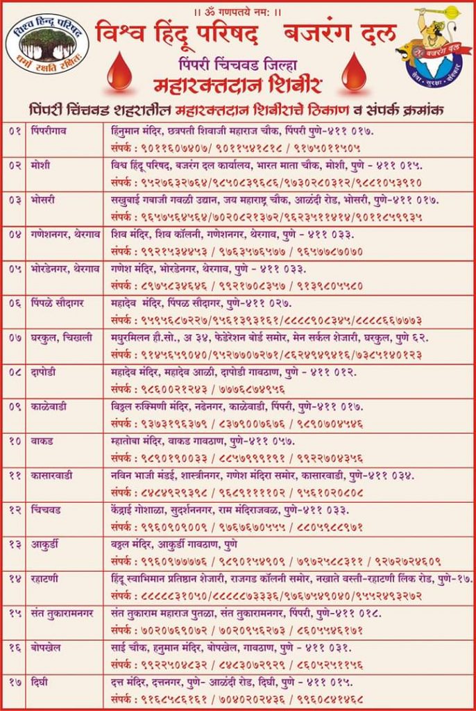 पिंपरी (Pclive7.com):- विश्व हिंदू परिषद, बजरंग दलवतीने श्रीराम जन्मभूमी आंदोलनातील हुतात्मा कोठारी बंधू व कारसेवेत बलिदान दिलेल्या असंख्य श्रीरामभक्तांच्या बलिदान समरणार्थ श्रद्धांजली वाहण्यासाठी दरवर्षी देशभरात महारक्तदान शिबिराचे आयोजन केले जाते. यावर्षी रविवार दि.२ फेब्रुवारी रोजी पिंपरी चिंचवड शहरातही महारक्तदान शिबिराचे आयोजन पिंपरी, चिंचवड, आकुर्डी, काळेवाडी, पिंपळे सौदागर, राहटणी, संत तुकाराम नगर, दापोडी, दिघी, बोपखेल, भोसरी, गणेशनगर थेरगांव, भोरडेनगर थेरगाव, वाकड, मोशी, घरकुल चिखली, कासारवाडी अशा तब्बल १७ ठिकाणी करण्यात आले आहे.