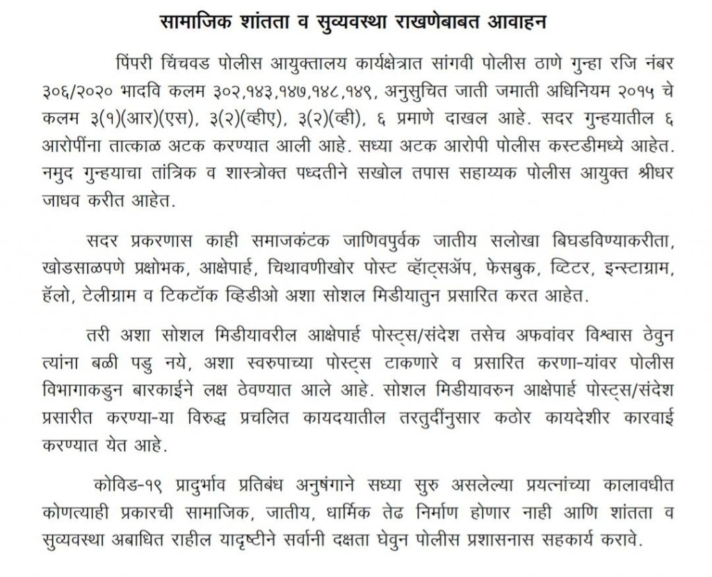पिंपळे सौदागर येथील विराज जगताप या तरूणाच्या खून रविवारी दि.०७ रोजी खून झाला होता. या घटनेनंतर ६ आरोपींना पोलीसांनी ताब्यात घेतले आहे. सध्या सर्व आरोपी पोलीस कस्टडीमध्ये आहेत. या गुन्ह्याचा तांत्रिक व शास्त्रोक्त पध्दतीने सखोल तपास सहाय्यक पोलीस आयुक्त श्रीधर जाधव करीत आहेत. मात्र या प्रकरणास काही समाजकंटक जाणिवपुर्वक जातीय सलोखा बिघडविण्याकरीता, खोडसाळपणे प्रक्षोभक, आक्षेपार्ह, चिथावणीखोर पोस्ट व्हॉट्सअॅप , फेसबुक, ट्विटर, इन्स्टाग्राम, हॅलो, टेलीग्राम व टिकटॉक व्हिडीओ अशा सोशल मिडीयातुन प्रसारित करत आहेत. अशा सोशल मिडीयावरील आक्षेपार्ह पोस्ट्स, संदेश तसेच अफवांवर नागरिकांनी विश्वास ठेवुन त्यांना बळी पडु नये. अशा स्वरुपाच्या पोस्ट्स टाकणारे व प्रसारित करणाऱ्यांवर पोलीस विभागाकडुन बारकाईने लक्ष ठेवण्यात आले आहे. सोशल मिडीयावरुन आक्षेपार्ह पोस्ट्स व संदेश प्रसारीत करणाऱ्यांवर विरुद्ध प्रचलित कायद्यातील तरतुदींनुसार कठोर कायदेशीर कारवाई करण्यात येत आहे. कोविड -१९ प्रादुर्भाव प्रतिबंध अनुषंगाने सध्या सुरु असलेल्या प्रयत्नांच्या कालावधीत कोणत्याही प्रकारची सामाजिक, जातीय, धार्मिक तेढ निर्माण होणार नाही आणि शांतता व सुव्यवस्था अबाधित राहील यादृष्टीने सर्वानी दक्षता घेवुन पोलीस प्रशासनास सहकार्य करावे असे आवाहन पिंपरी चिंचवड पोलिसांकडून करण्यात आले आहे.