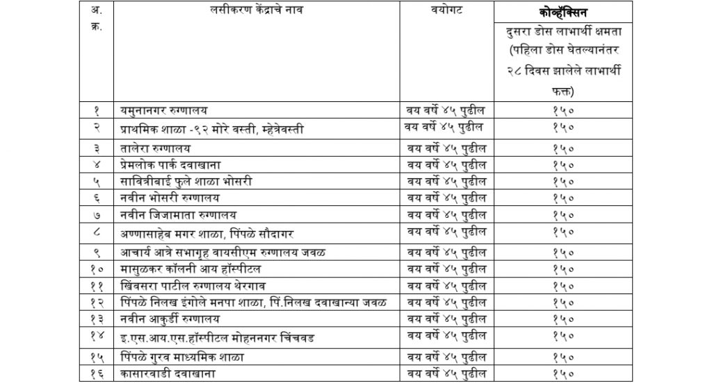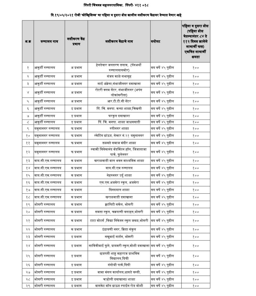 त्याचबरोबर ४५ वर्षांपुढील नागरिकांना उद्या कोविशिल्डचा पहिला व दुसरा डोस महापालिकेच्या आकुर्डी, यमुनानगर, वायसीएमएच, भोसरी, सांगवी, थेरगाव, जिजामाता, तालेरा रुग्णालयातील ५० केंद्रांवर देण्यात येणार आहे. दुसरा डोस १२ ते १६ आठवडे पूर्ण झालेल्यांनाच दिला जाणार आहे. १८ ते ४४ वयोगटातील लाभार्थ्यांनी लसीकरण केंद्रावर गर्दी करु नये, असे आवाहन महापालिकेने केले आहे.