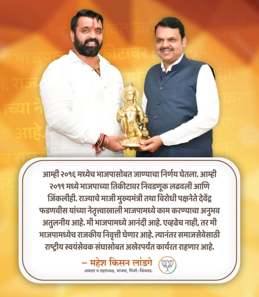 दरम्यान आमदार महेश लांडगे यांनी एक ‘पोस्ट’ शेअर करत सुरू असलेल्या चर्चेला पुर्णविराम दिला आहे. महेश लांडगे यांनी म्हटले आहे की, “आम्ही २०१६ मध्येच भाजपासोबत जाण्याचा निर्णय घेतला. आम्ही २०१९ मध्ये भाजपाच्या तिकीटावर निवडणूक लढवली आणि जिंकलीही. राज्याचे माजी मुख्यमंत्री तथा विरोधी पक्षनेते देवेंद्र फडणवीस यांच्या नेतृत्त्वाखाली भाजपामध्ये काम करण्याचा अनुभव अतुलनीय आहे. मी भाजपामध्ये आनंदी आहे. एव्हढेच नाही, तर मी भाजपामध्येच राजकीय निवृत्ती घेणार आहे. त्यानंतर समाजसेवेसाठी राष्ट्रीय स्वयंसेवक संघासोबत अखेरपर्यंत कार्यरत राहणार आहे.”